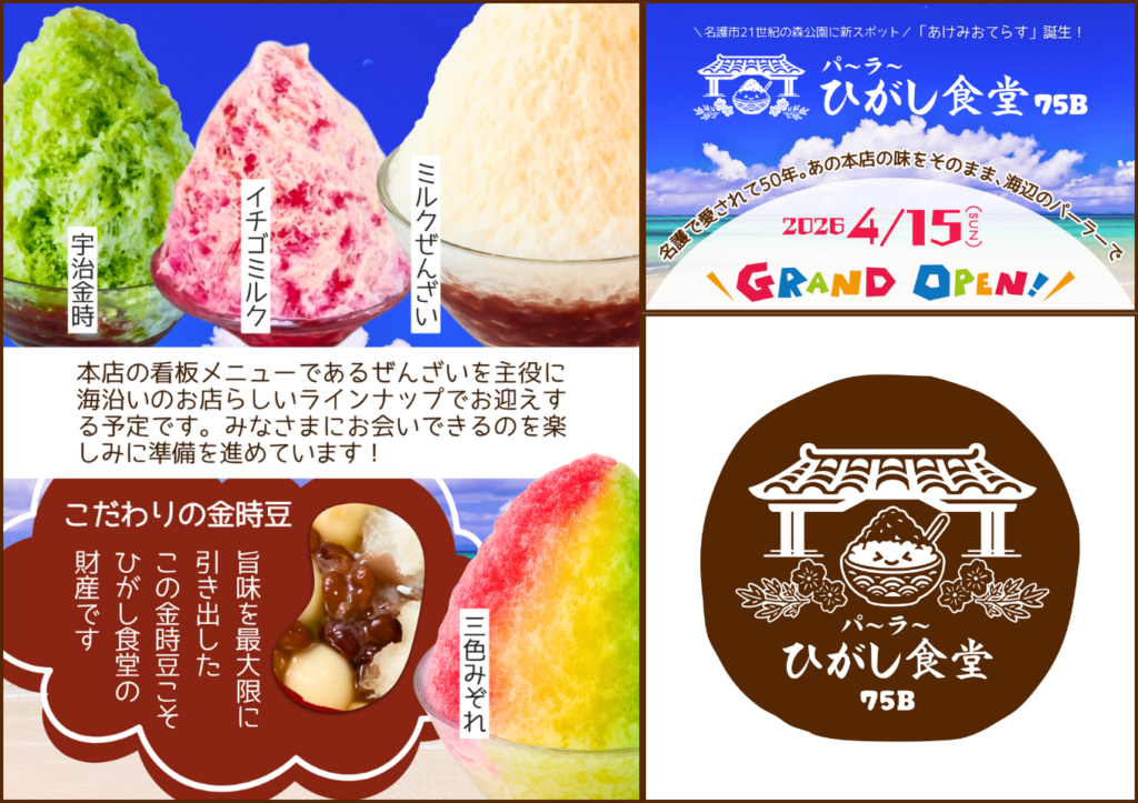 初めまして!あけみおてらす内にオープンする『パ〜ラ〜ひがし食堂75B』です。名護で愛され続ける老舗『ひがし食堂』のミルクぜんざいの味をそのままに、ビーチで楽しめるパーラーになりました!